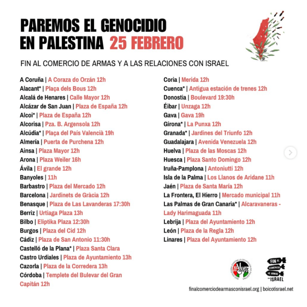 Recordaros que este domingo 25 de febrero habrá una movilización a nivel estatal en España para exigir el alto al fuego y el fin al comercio de armas y a las relaciones con Israel