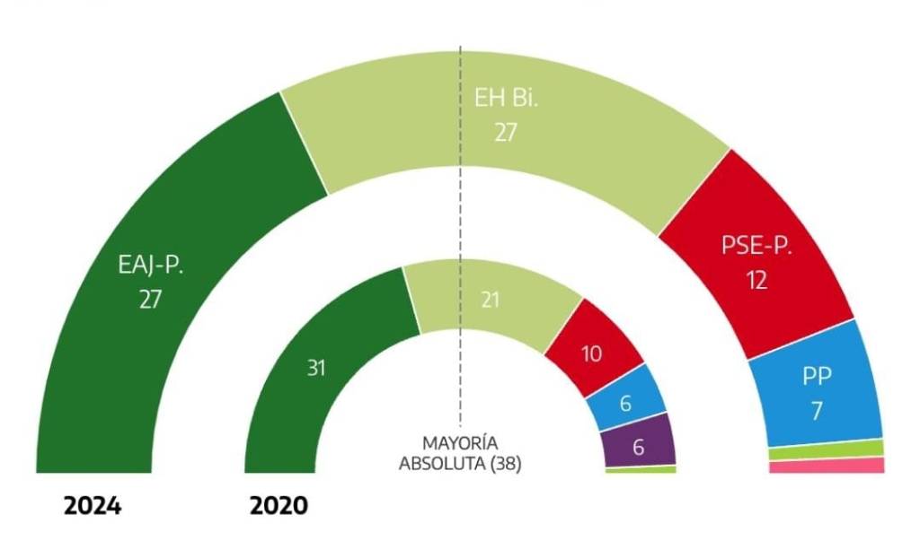 El PNV y EHbildu empatan con 27 escaños cada formación. la tercera fuerza política es el PSE con 12 escaños, seguido del PP con 7. Como novedad, se incorpora Sumar con 1 escaño, y VOX mantiene su escaño. Elkarrekin Podemos queda fuera del Parlamento vasco.