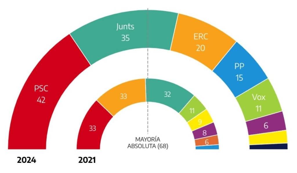 El PSC gana las elecciones con 42 escaños, 9 más que en las últimas elecciones. En segunda posición está JxCat con 35 escaños, habiendo conseguido 3 escaños más. La tercera fuerza es ERC, que consigue 20 escaños, es decir, ha perdido 13 respecto las últimas elecciones. En cuarto lugar tenemos al PP con 15 escaños, logrando así 12 escaños más. Vox mantiene sus 11 escaños y Comuns Sumar pierde 2 escaños, se queda con 6. Por su parte, la CUP pierde 5 escaños y se queda con 4, y Ciudadanos no entra en el Parlament. Como novedad, la extrema derecha independentista entra con 2 escaños.
