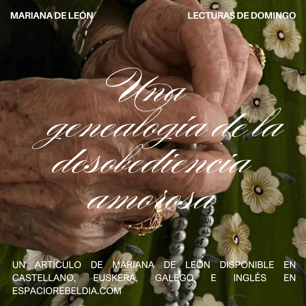 Disobeying romantic love doesn’t mean to stop loving, it means to stop believing in that promise of surrender that always is expected of us. My grandmother waited, my mother justified, and I write: there is no redemption in the other half, only the amputation of half your life. The genealogy of disobedience starts here: in writing, in the desire that no longer hides or apologises. They aren’t grand gestures; they are absences, silences, kept wants. Love doesn’t obey; neither do we. Love can be staying, leaving, break everything, creating, coming back. Loving is ours. And we’ll do it however we want to.