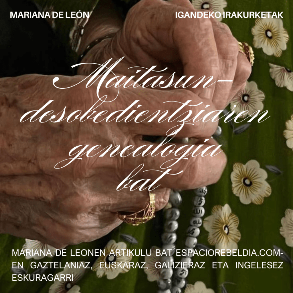Maitasun erromantikoa desobeditzea ez du esan nahi maitatzeari uztea, baizik eta beti guri uko egitea eskatzen digun emate-promesa horretan sinesten uztea. Nire amonak itxaron zuen, nire amak arrazoitu zuen, eta nik idazten dut: ez dago erredentziorik laranja erdian, soilik bizitza erdi baten galera. Desobedientziaren genealogia hemen hasten da: idazkeran, jada ezkutatzen ez den eta barkamena eskatzen ez duen desiran. Ez dira keinu handiak: isiltasuna da, gabezia, gordetako gogoak. Maitasunak ez du obeditzen; gu ezta ere. Maitatzea geratzea izan daiteke, urruntzea, dena haustea, asmatzea, itzultzea. Maitatzea gurea da. Eta nahi dugun bezala egingo dugu.