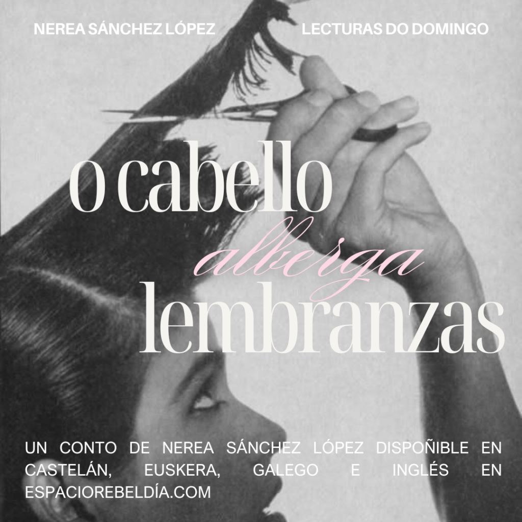 —O cabelo alberga lembranzas, moza —chanta a perruqueira mirándome en fite, cravándome os ollos. É maior, ten os ollos máis azuis có ceo de xullo e o cabelo cano.