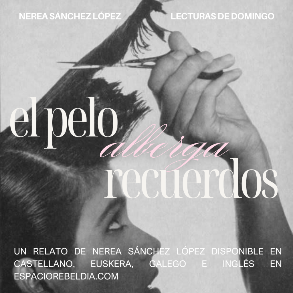 Niri begiratu ere egin gabe, iledi luzea motots batean bildu eta metalezko guraizeak hartzen ditu. Zorrotzak eta beldurgarriak dira, eta nire azaroak desegitearen bidean daude, pisatzen nauen hori guztia. Ilea horren pisutsua sentitzen dut luzea delako, edo biltzen dituen momentu tristeen kopuruagatik? Agian bien nahasketa bat da, ez dut inoiz jakingo.