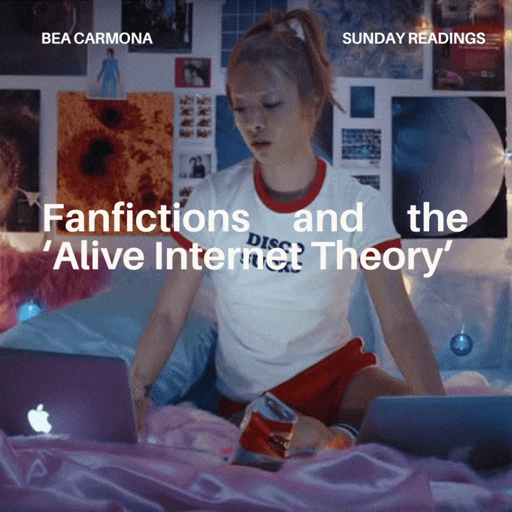 Reading and writing fan fiction is part of the ‘Alive Internet Theory.’ These are pieces of text made by and for people, circulating within fan communities and serving as a way for people with similar tastes to express themselves and interact with each other.